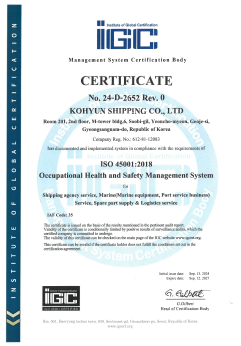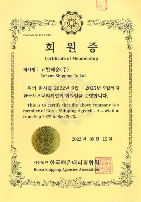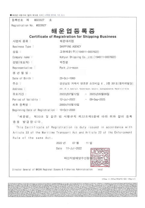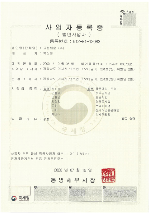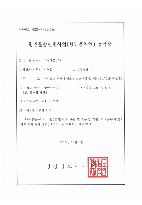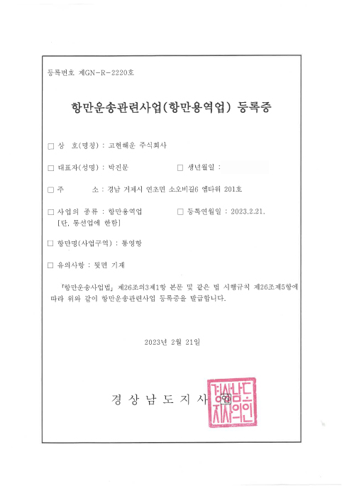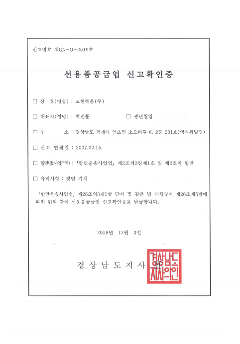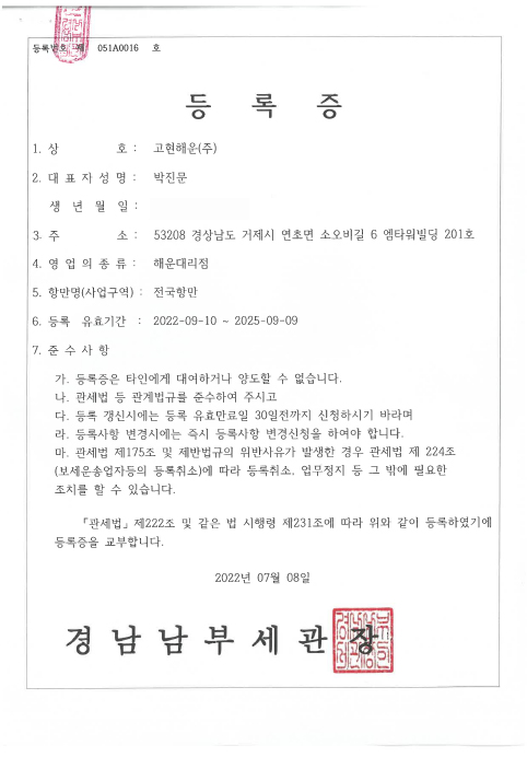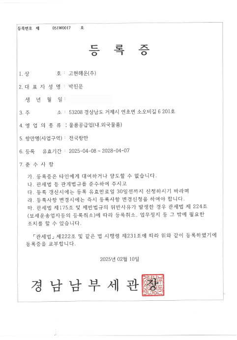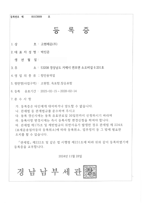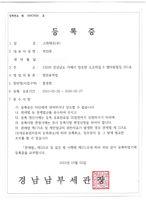 항만용역업등록증(고현항,옥포항,장승포항) 경남남부세관